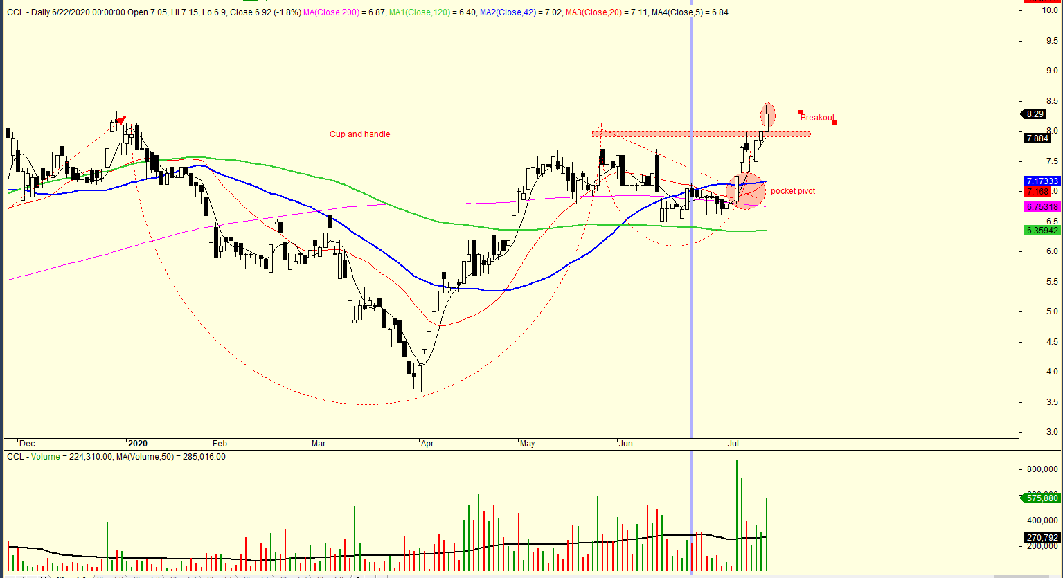 Tương tự, CCL cũng tiếp tục tăng điểm sau điểm Pocket Pivot, một kỹ thuật mua sớm trước điểm breakout của mẫu hình Cup and handle.