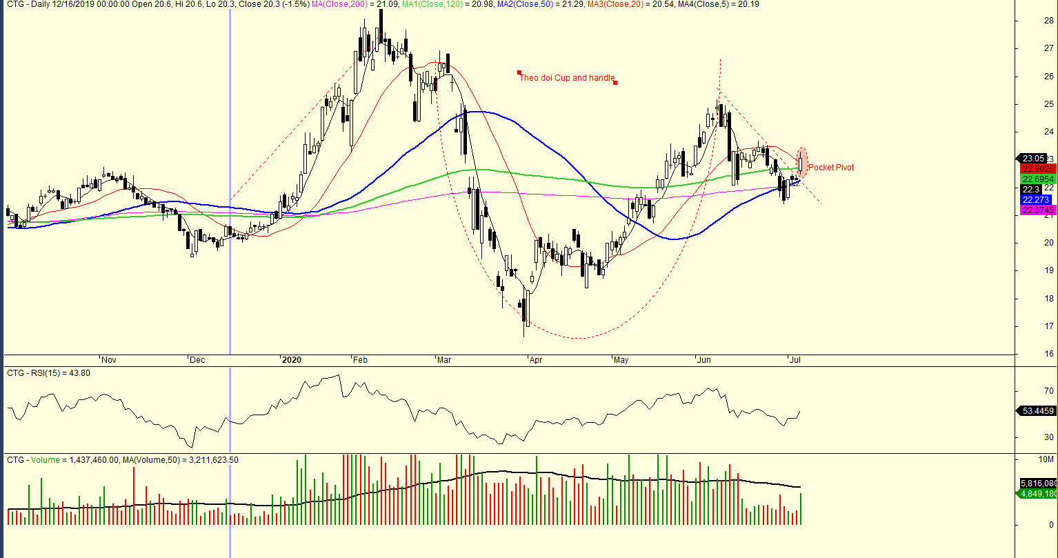 Một số cổ phiếu leader hoạt động tốt trong phiên giao dịch ngày hôm nay. CTG có điểm mua Pocket Pivot của nhóm Trend Trader trong phiên giao dịch ngày hôm nay. Đây cũng có thể được cọi là chiến lược “Pullback to MA50” của CANSLIM (giá kéo ngược về MA50 ngày vối khối lượng thấp và bật dậy với khối lượng cao). Chúng tôi theo dõi mẫu hình Cup and handle ở cổ phiếu này.