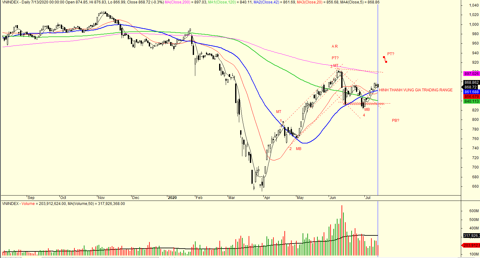 Về mặt hành động giá, để có điểm mua theo mẫu hình zigzag trong kênh giá, MA5 cần cắt lên MA20 ngày hoặc giá vượt qua đỉnh ngày 23/6/2020.
