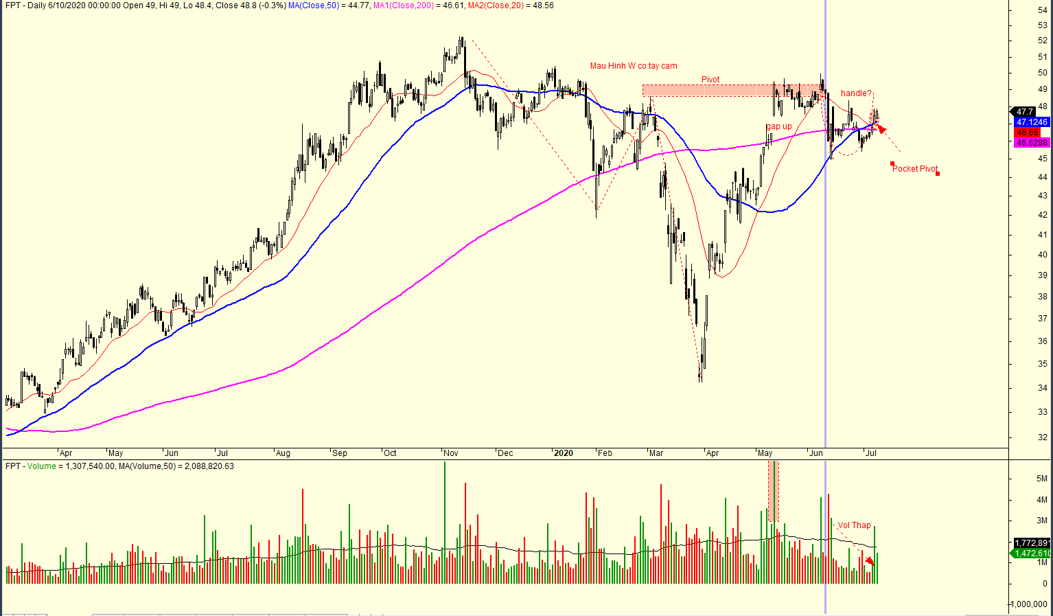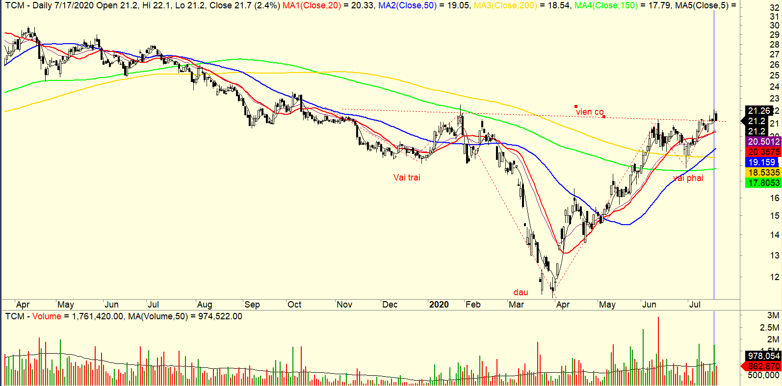 TCM là cổ phiếu tiêu điểm hôm nay sau điểm mua Pocket Pivot ở phiên ngày 7/7/2020. Ngày 8/7/2020, TCM tiếp tục có điểm breakout của mẫu hình lá cờ được miêu tả bởi Mark Minervini và CANSLIM. Cột cờ tăng 87% trong hai tháng trong khi lá cờ giảm -13% với khối lượng thấp trong thời gian chưa tới 4 tuần. Rõ ràng, điểm mua Pocket Pivot đang mang lại lợi thế cho các Trend Trader.