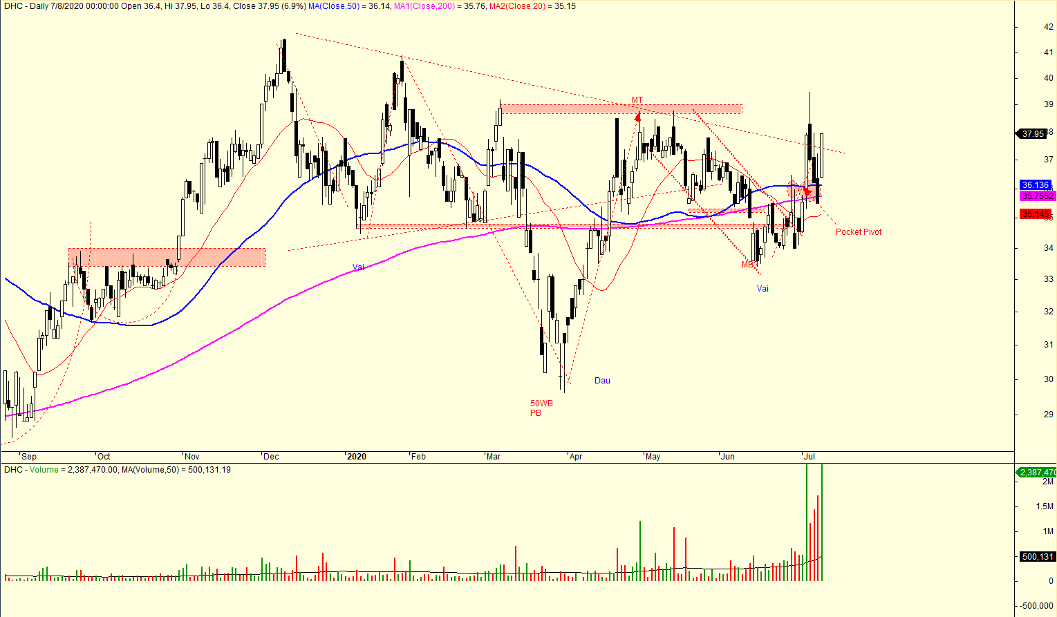 Chúng tôi sớm có vị thế ở DHC với mức giá thấp nhờ điểm mua Pocket Pivot, một kỹ thuật mua của Trend Trader. Xem lại tại đây