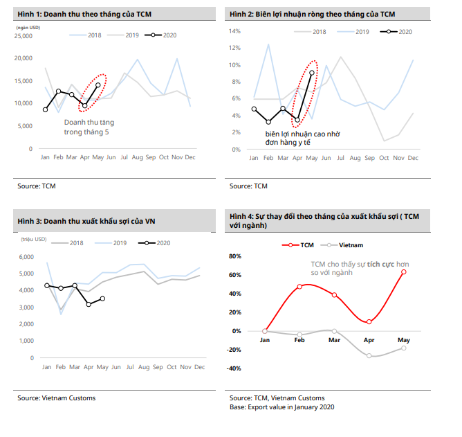 Thông tin tại đại hội cổ đông ngày 21/6/2020, TCM ước lãi quý 2 tăng 36% so với cùng kỳ năm trước. Hoạt động kinh doanh của TCM khả quan nhờ đơn hàng khẩu trang kháng khuẩn xuất đi Mỹ. Doanh nghiệp chủ động về nguồn sản xuất vải nên thời gian hoàn thành tốt hơn nhiều so với các doanh nghiệp khác. TCM hy vọng EVFTA sẽ làm tăng nhu cầu đối với vải đan kim. Được biết, biên lợi nhuận mặt hàng khẩu trang cao gấp đôi biên lợi nhuận hiện tại nên dù doanh số giảm nhưng lợi nhuận của TCM vẫn tăng.