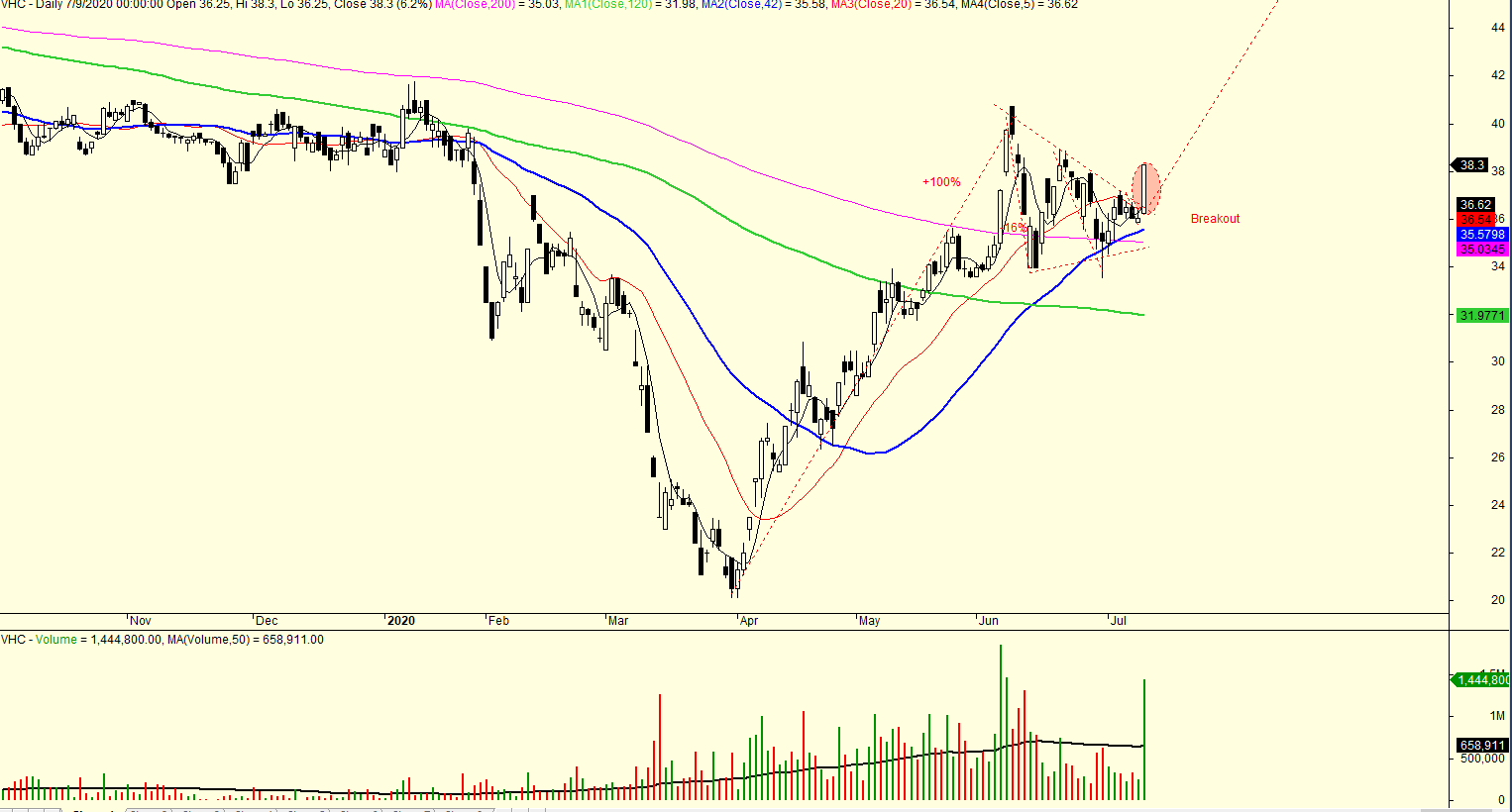VHC là tiêu điểm ngày hôm nay của chúng tôi với mẫu hình lá cờ. Cột cờ tăng 100% trong hai tháng, lá cờ giảm -16% trong hai tuần với vol thấp. Điểm breakout trùng với Pocket Pivot và có khối lượng lớn. VHC tăng đột biến nhờ hướng dẫn lợi nhuận tích cực (xem thêm ở sách của Mark Minervini). Báo Cafef đăng tin phỏng vấn CEO Vĩnh Hoàn – bà Nguyễn Ngô Vi Tâm:  cho rằng lợi nhuận mảng C&G (sản phẩm mới) của VHC năm nay tăng gấp đôi năm ngoái lên 400 tỷ đồng.