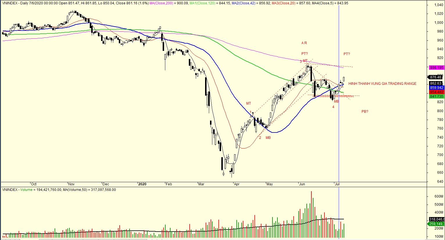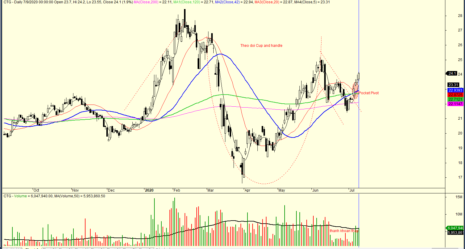 Hành động giá của VN-Index nói chung là tích cực. Cú giảm từ đỉnh ngày 11.6.2020 về đáy ngày 30.6.2020 diễn ra với khối lượng thấp khi giá kéo ngược về MA50 ngày. Đó là một dấu hiệu tốt theo CANSLIM. Điều này cho thấy các tổ chức không bán tháo mà đang hấp thụ các tay chơi yếu hơn (những người mong muốn chốt lãi).