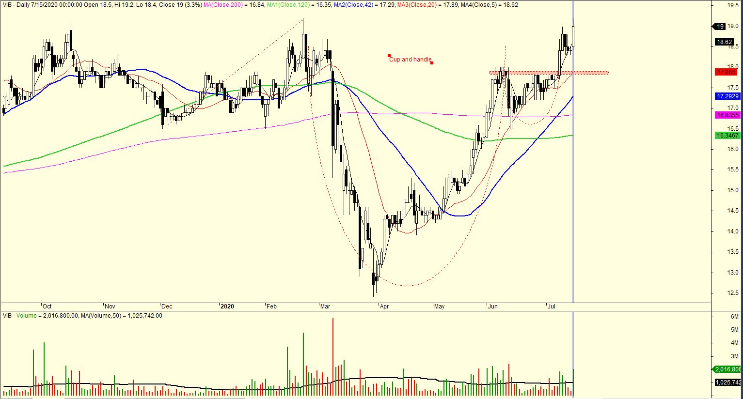 Cổ phiếu VIB sau điểm mua Breakout mẫu hình Cup and handle vẫn đang tăng giá tốt