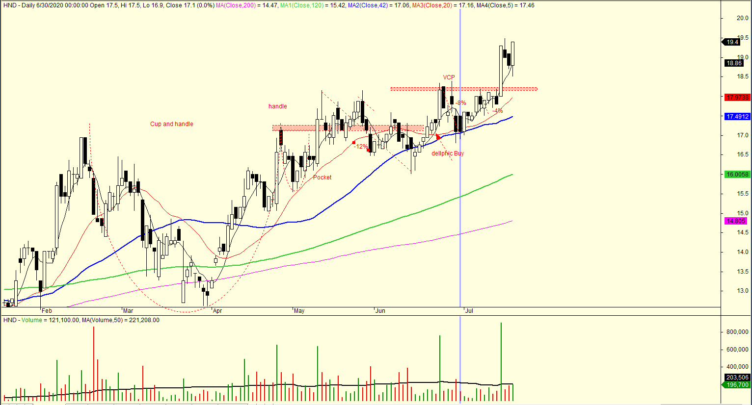 Bằng cách tra bảng RS, trader có thể tìm cho mình các cổ phiếu có nền tảng cơ bản tốt và nền giá kiến tạo. HND có RS bằng 92 và đồ thị có dạng mẫu hình VCP chồng trên chiếc cốc-tay cầm. Chúng tôi sớm có vị thế ở HND nhờ điểm mua Pocket Pivot và Dellphic Buy của Trend Trader.