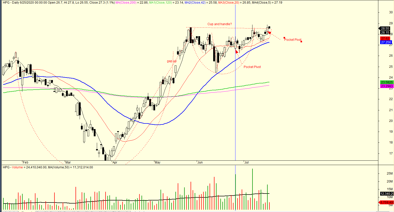 Cổ phiếu HPG có RS bằng 86 và nền giá Cup (có thể có tay cầm) đang xuất hiện. Trước mẫu hình chiếc cốc tay cầm, một khoảng trống tăng giá cho thấy lực cầu mạnh từ các tay chơi lớn. Chúng tôi đã có vị thể ở HPG nhờ các điểm mua Pocket Pivot, một kỹ thuật mua sớm của Trend Trader.