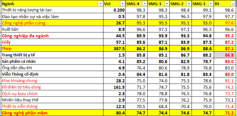 Đóng cửa tuần ngày 17/7/2020, Chỉ số VN-Index giảm 0.55% với khối lượng cao hơn phiên trước. Vì thế, đây là phiên phân phối đối với VN-Index. Tuy nhiên, các leader lại hoạt động tốt hơn so với thị trường. Bảng RS (Sức Mạnh Giá) theo các nhóm ngành cho thấy, thép, giấy (gọi chung là nhóm tài nguyên cơ bản) và cổ phiếu công nghệ (bao gồm công nghệ phần cứng và công nghệ phần mềm) đang đứng đầu bảng.