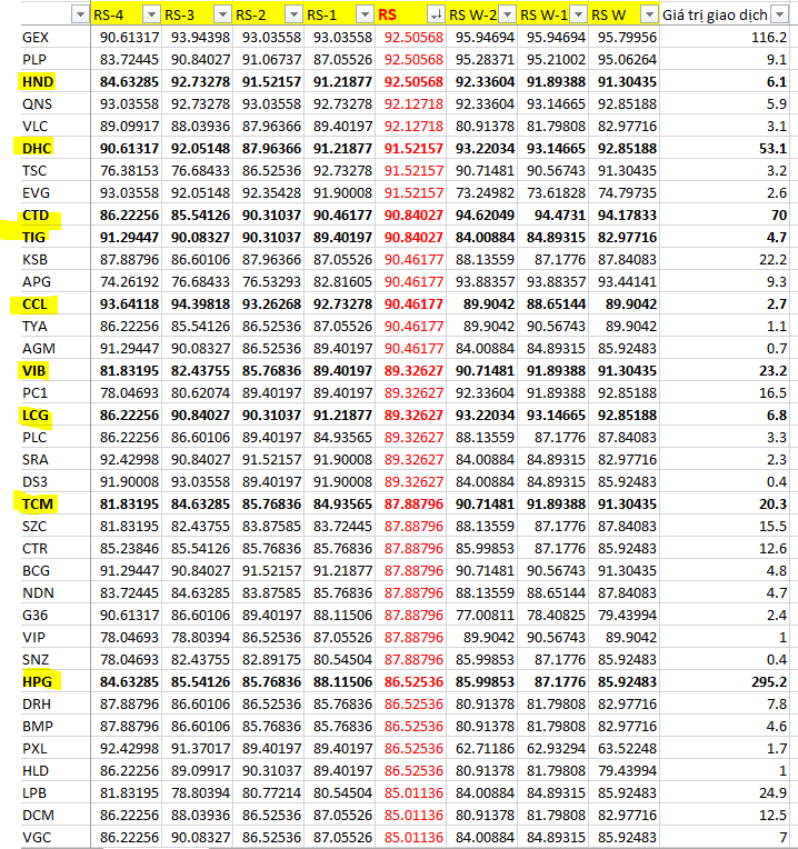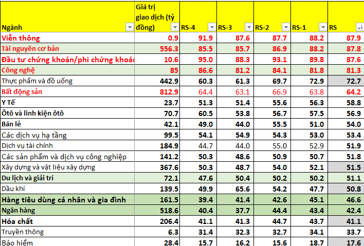 Ghi chú: Giá trị giao dịch tính theo tỷ đồng. RS là Sức Mạnh Giá Tương Đối tại ngày ngày hiện tại. RS-1 là cách đó 1 ngày. RS W là Sức Mạnh Giá Tương Đối của tuần hiện tại. Danh sách trên chỉ là một phần, không phải bản đầy đủ.