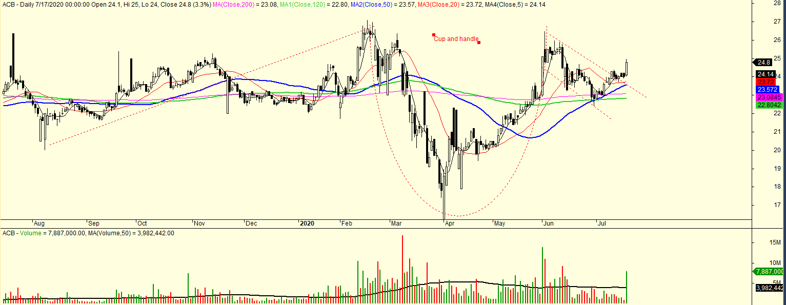 Dòng cổ phiếu ngân hàng bắt đầu mạnh lên mặc dù RS còn khá thấp. Nhưng một số mã cổ phiếu có RS khá cao. ACB có RS=76. Và điểm mua Pocket Pivot đã xuất hiện. Đây là một kỹ thuật mua truyền thống trước điểm breakout truyền thống của O’Neil.