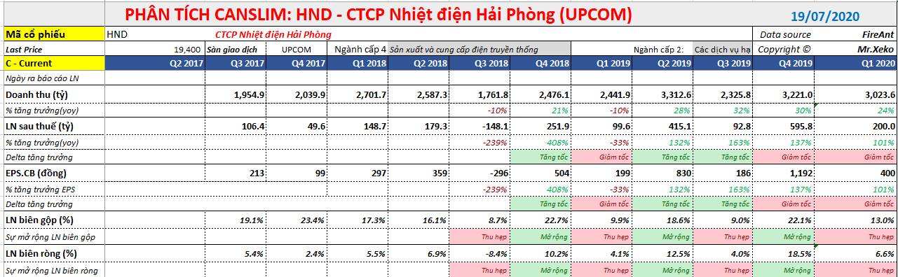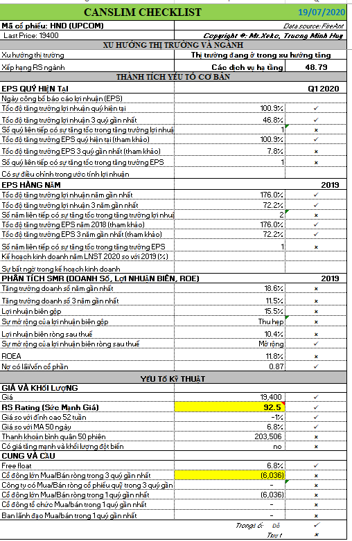 Danh sách kiểm tra CANSLIM Checklist cho thấy HND đã vượt đỉnh 52 tuần, cổ phiếu cô đặc với Free Float thấp (7%). HND có tỷ lệ nợ có lãi/ vốn cổ phần là 0.87 và đang trong xu hướng giảm dần. Với dòng tiền tự do 3,000 tỷ đồng mỗi năm, HND được kỳ vọng sạch nợ trong vòng 2 năm tới. ROE năm 2019 là 19.7% và bình quân ba năm là 11.8%. Công ty đang có sự tăng tốc trong tăng trưởng lợi nhuận 2 năm liên tiếp. Tốc độ tăng trưởng doanh số năm 2019 là 18.5%