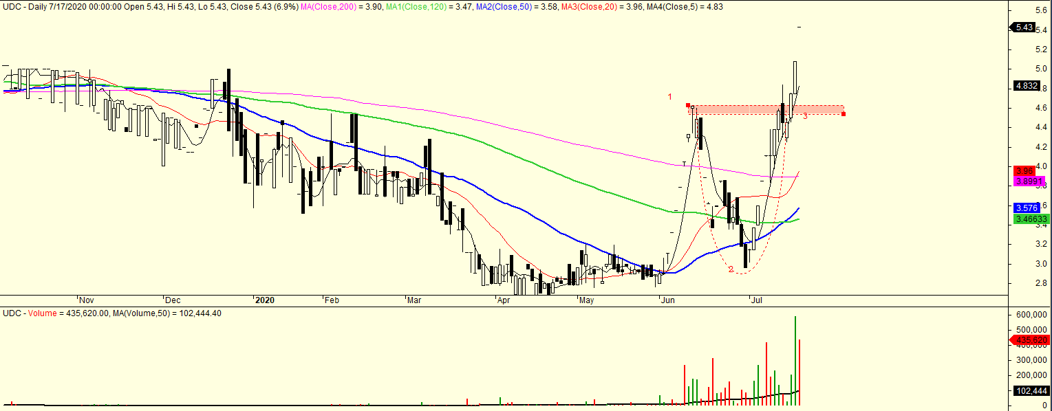 Chúng tôi cũng đưa vào quan sát các cổ phiếu bất động sản vốn hóa nhỏ có điểm breakout mẫu hình 1-2-3 như UDC. Khối lượng gia tăng đột ngột ở cổ phiếu này. Nhà nước đang có kế hoạch thoái vốn 68% cổ phiếu tại công ty này về 0%. Đây là một chất xúc tác. Nhớ lại HDC, DIG khi có thoái vốn cũng từng tạo ra cơn sóng tăng mạnh mẽ