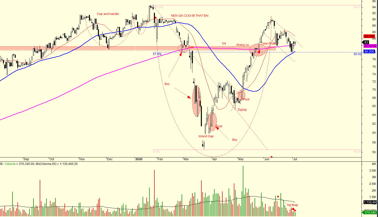 VCB xuất hiện Pin Bar vào ngày thị trường đỏ lửa. Giá kiểm tra lại vùng Bottom Reversal vào ngày 1.7.2020 và hình thành Pin Bar vào ngày 25/7/2020 cho thấy có lực cầu hỗ trợ. Có ba đáy liên tiếp trong vùng thời gian 4-5 tuần là điểm cần chú ý. Một số cổ phiếu ưa thích đảo chiều theo mô hình này. Dĩ nhiên, chúng ta cần hành động giá xác nhận sự đảo chiều của Pin Bar.