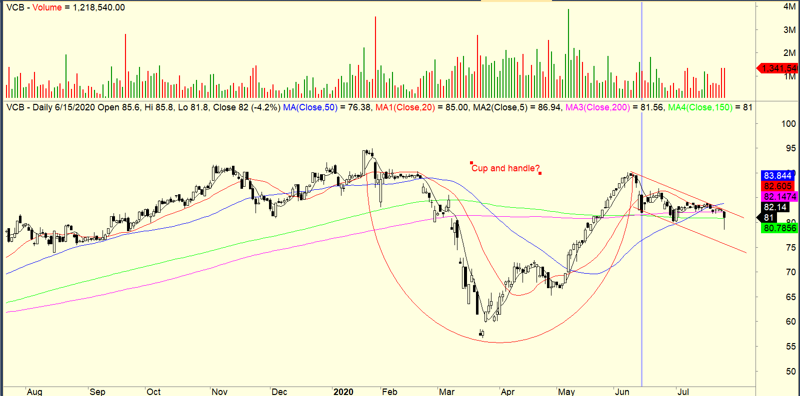 Chúng tôi đang theo dõi chiếc cốc-tay cầm lớn ở VCB. Trong thị trường khủng hoảng, các mẫu hình Cốc-Tay cầm lớn thường xuất hiện. Tay cầm của VCB đang có độ sâu -13%