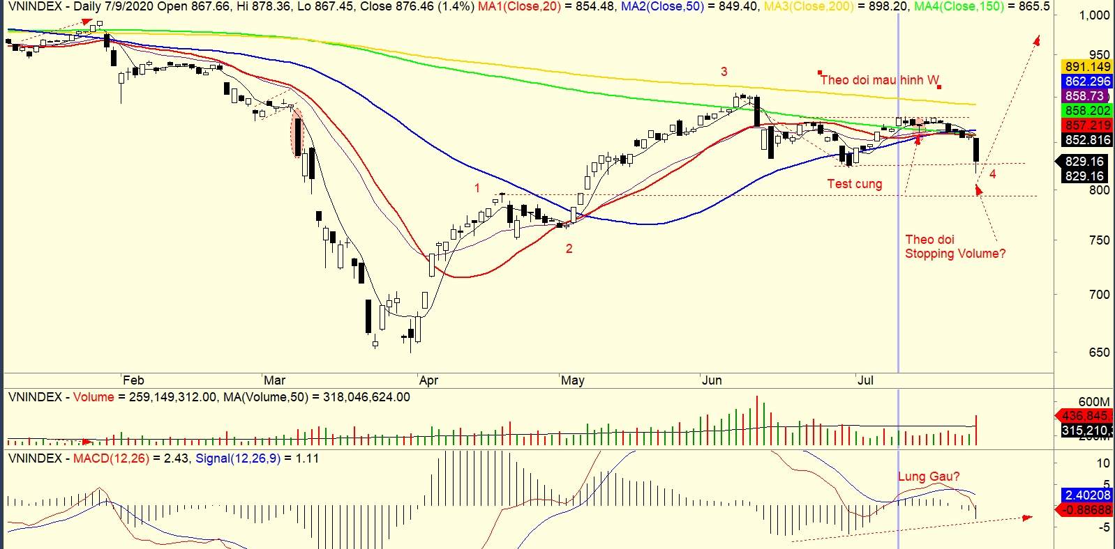 Với ba ngày phân phối và mốc MA50 ngày bị mất, nỗ lực hồi phục từ đáy 30/6/2020 đã thất bại. Triển vọng thị trường hiện tại là ” XU HƯỚNG TĂNG CÓ THỂ BỊ THAY ĐỔI”.