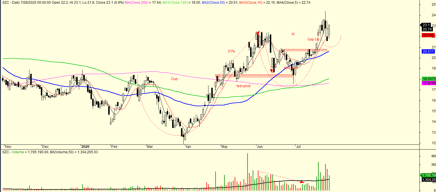 Một số leader vẫn trụ tốt qua cuộc biến động covid vừa rồi. SZC là một ví dụ, cổ phiến vẫn giữ MA10 ngày là lý do chúng tôi vẫn đang nắm giữ cổ phiếu này. Các leader biết cách trụ lại qua những đợt điều chỉnh của thị trường chung và các CANSLIMer nên biết cách nắm giữ các siêu cổ phiếu. SZC được mua vào theo chiến lược Gap Up và Pullback to MA50 bởi Trend Trader.