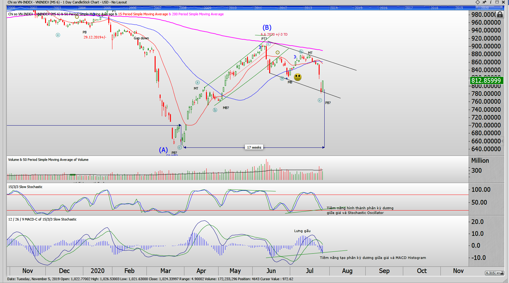 Về cấu trúc và hành động giá. Tôi đã lưu ý tiềm năng xuất hiện phân kỳ dương giữa giá và MACD Histogram cũng như Stochastic Oscillator. Ngoài ra, bạn đọc có thể theo dõi chi tiết bình luận dưới góc nhìn sóng Elliott và chu kỳ.