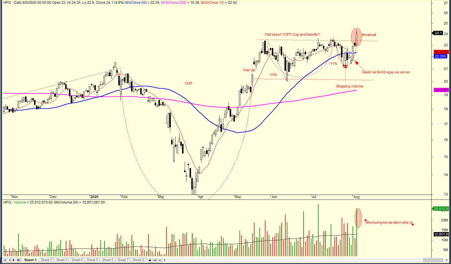 Như lưu ý ở các bản tin trước, HPG đang có dấu hiệu của leader nhờ việc giữ giá tốt. Cổ phiếu tạo mẫu hình Nền Giá phẳng chồng trên chiếc cốc.