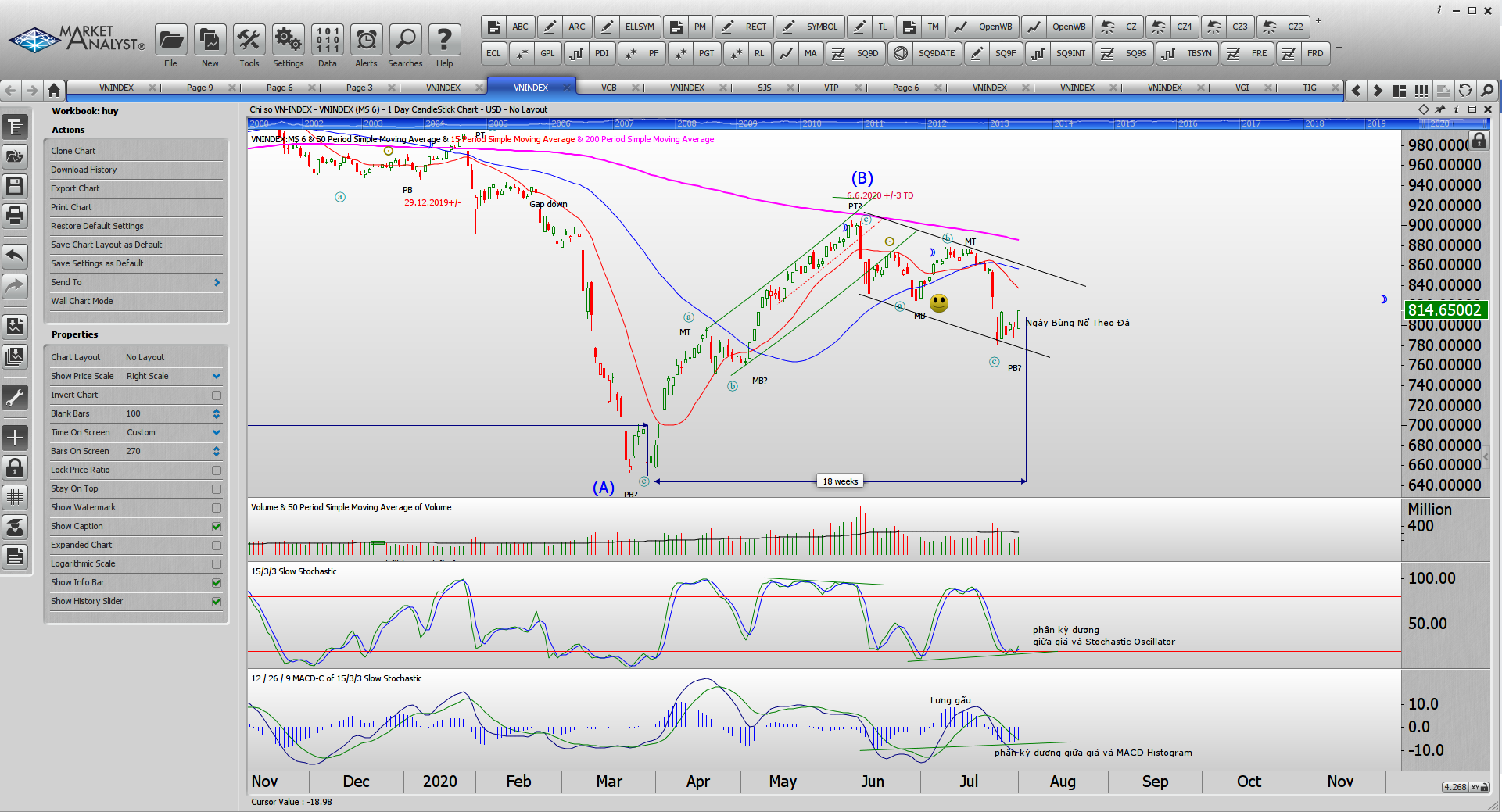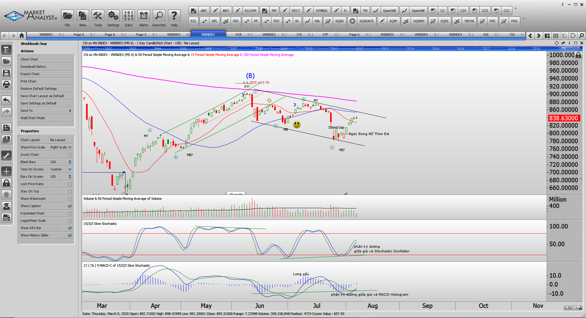 Hiện tại, phiên FTD đã làm xuất hiện tín hiệu phân kỳ giữa giá với MACD Histogram và Stochasti Oscillator. Lưng gấu đã bị bẻ. Giá đang hoạt động trong kênh giá và chúng tôi chờ xem giá có vượt qua được MA20 ngày sau đó là MA50 ngày cho các xác nhận chắc chắn hơn (đùa tí: có vẻ như admin có nhiều nấc xác nhận quá. Vậy sử dụng dấu hiệu xác nhận nào thì bí quyết nghề nghiệp nhé).