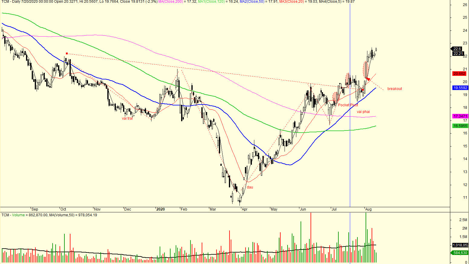 Các cổ phiếu leader hoạt động tốt như kỳ vọng. TCM tăng trần tạo nên phiên breakout mẫu hình vai đầu vai ngược. Điểm mua Gap Up trùng với phiên breakout. Cổ phiếu TCM được chúng tôi giữ suốt hơn 1 tháng qua sau điểm mua Pocket Pivot của Trend Trader.