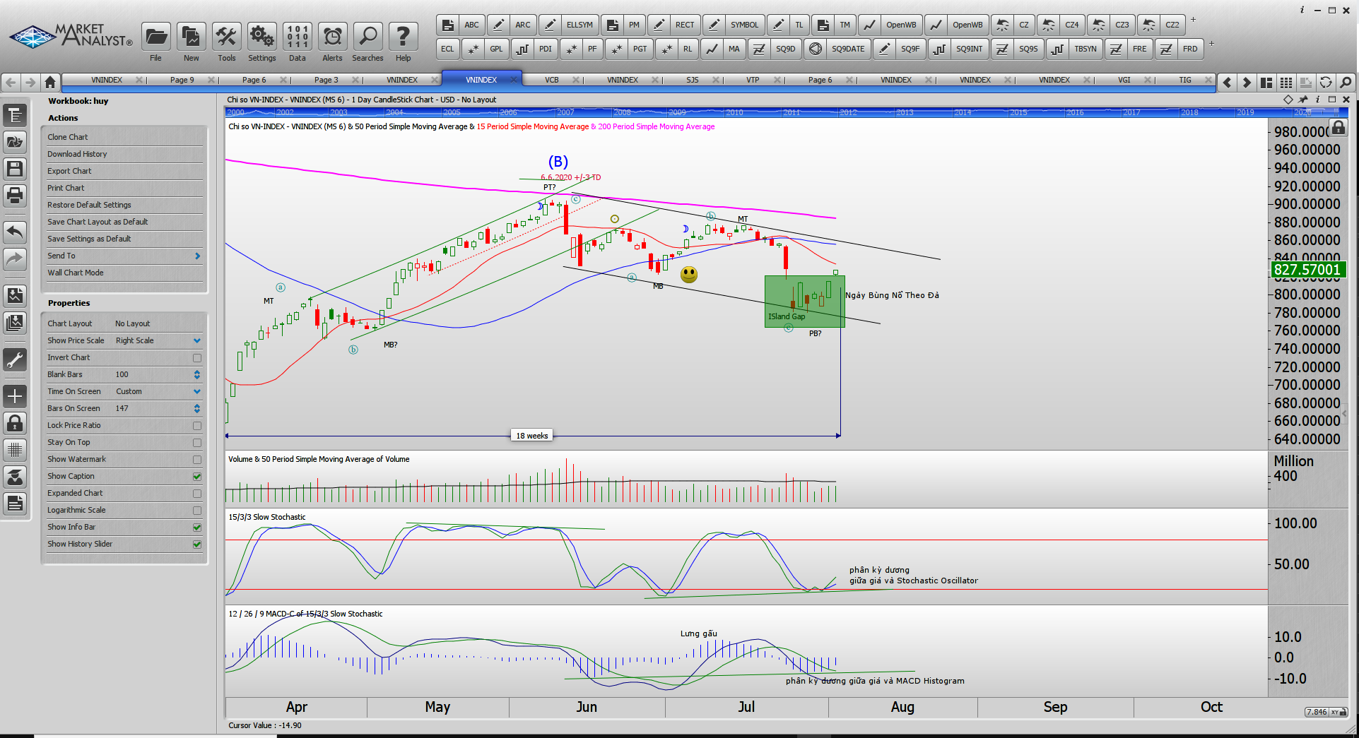Sau phiên FTD, mẫu hình đảo chiều tăng giá Island Gap xuất hiện, củng cố thêm sức mạnh cho đà tăng của chỉ số VN-Index. Lưu ý ở phiên trước, chúng ta đã có phân kỳ dương giữa giá với MACD Histogram cũng như Stochastic Oscillator.