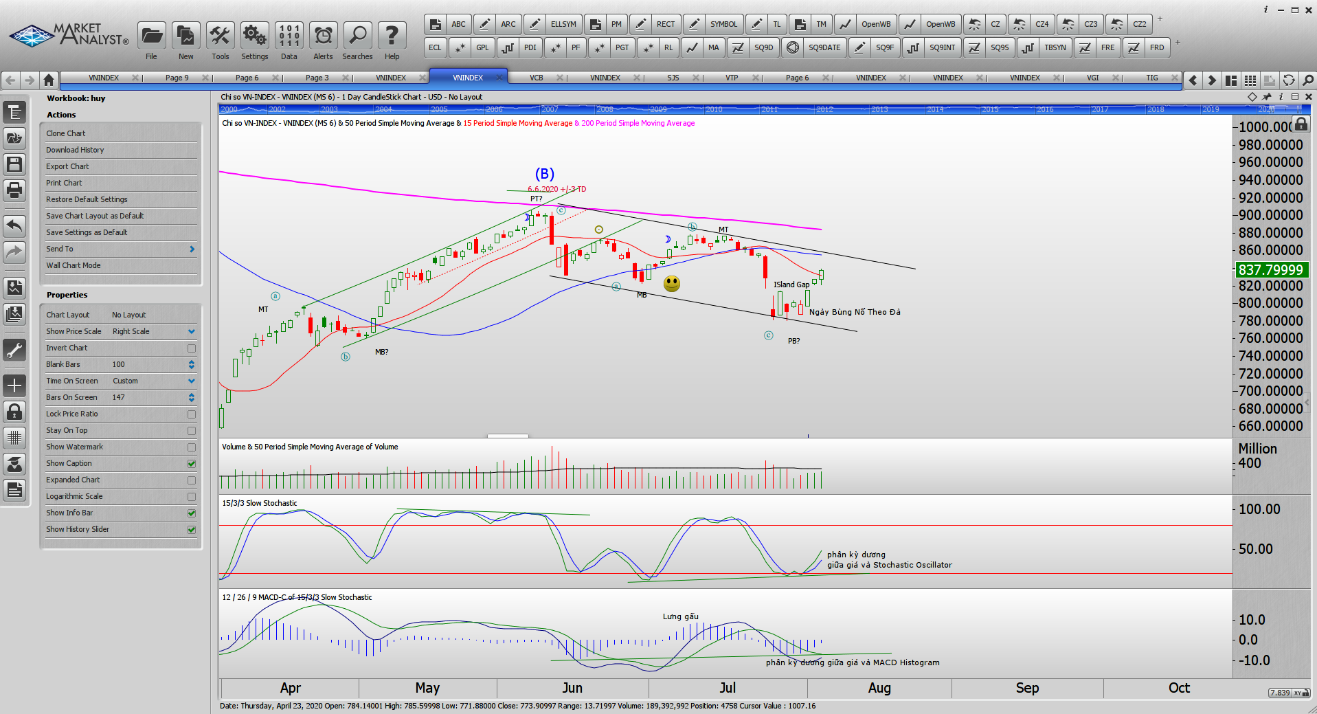 Ít nhất, Stochastic Oscillator vẫn chưa vào vùng mua quá mua nên chúng tôi vẫn kỳ vọng vào lực tăng. MACD Histogram đang chờ cắt đường 0 để cho tín hiệu mua mạnh hơn. Hãy chú ý VN-Index đang hoạt động trong kênh giá. Chúng tôi muốn nhìn thấy VN-Index breakout khỏi vùng kênh giá này để bảo đảm trend tăng dài hạn được tiếp diễn.