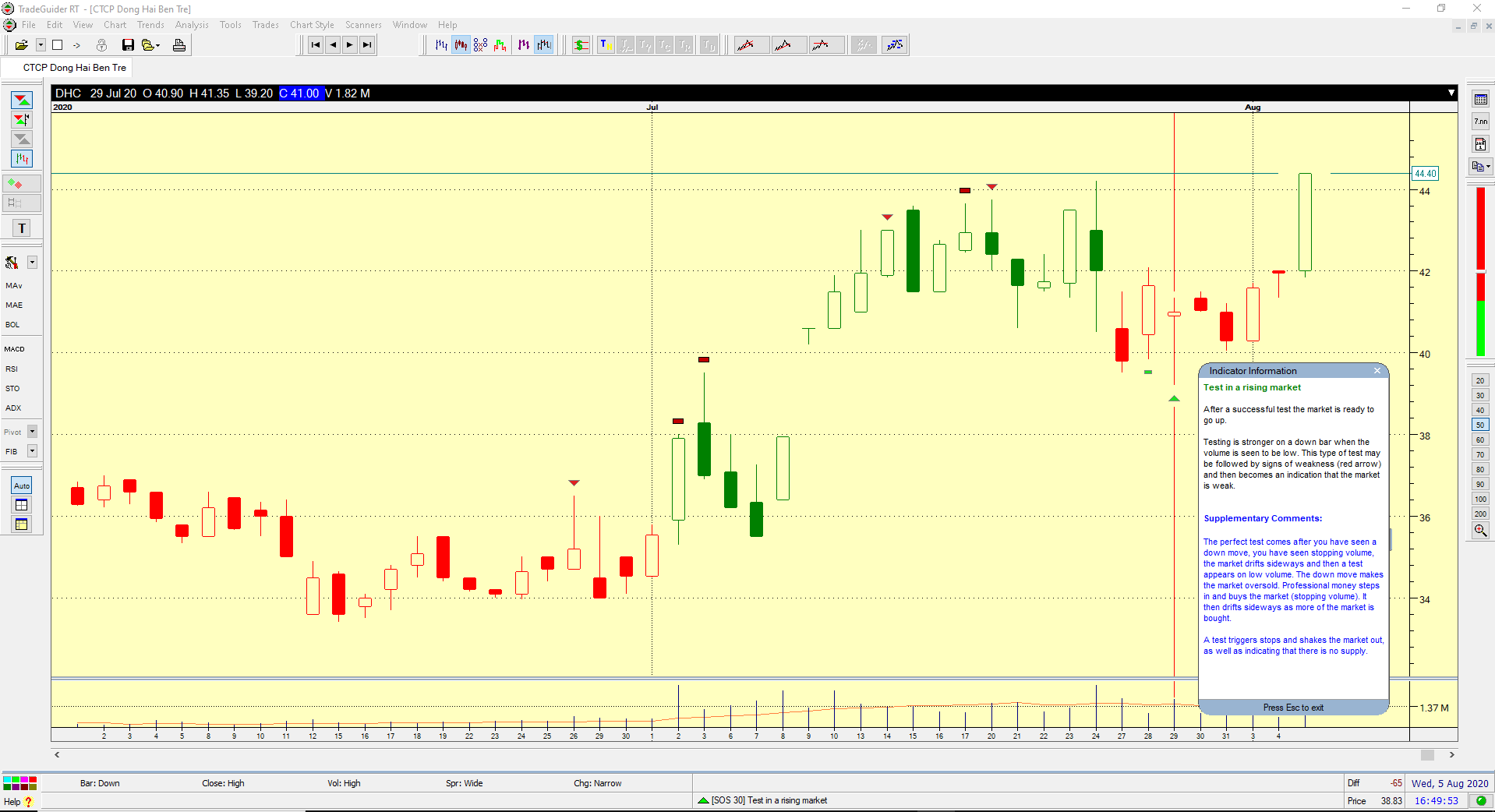 Thậm chí, trong trường hợp của DHC chúng tôi lại giao dịch cực kỳ năng động. Bằng cách chốt lãi khi giá tăng hơn 20% vào ngày 15/7/2020 so với điểm mua, chúng tôi lợi dụng EMA 21 ngày kết hợp với các hành động giá khác theo VSA là “Bottom Reversal” và “Test in a rising market) để quay trở lại mua số hàng đã chốt với giá vốn thấp hơn. Great!
