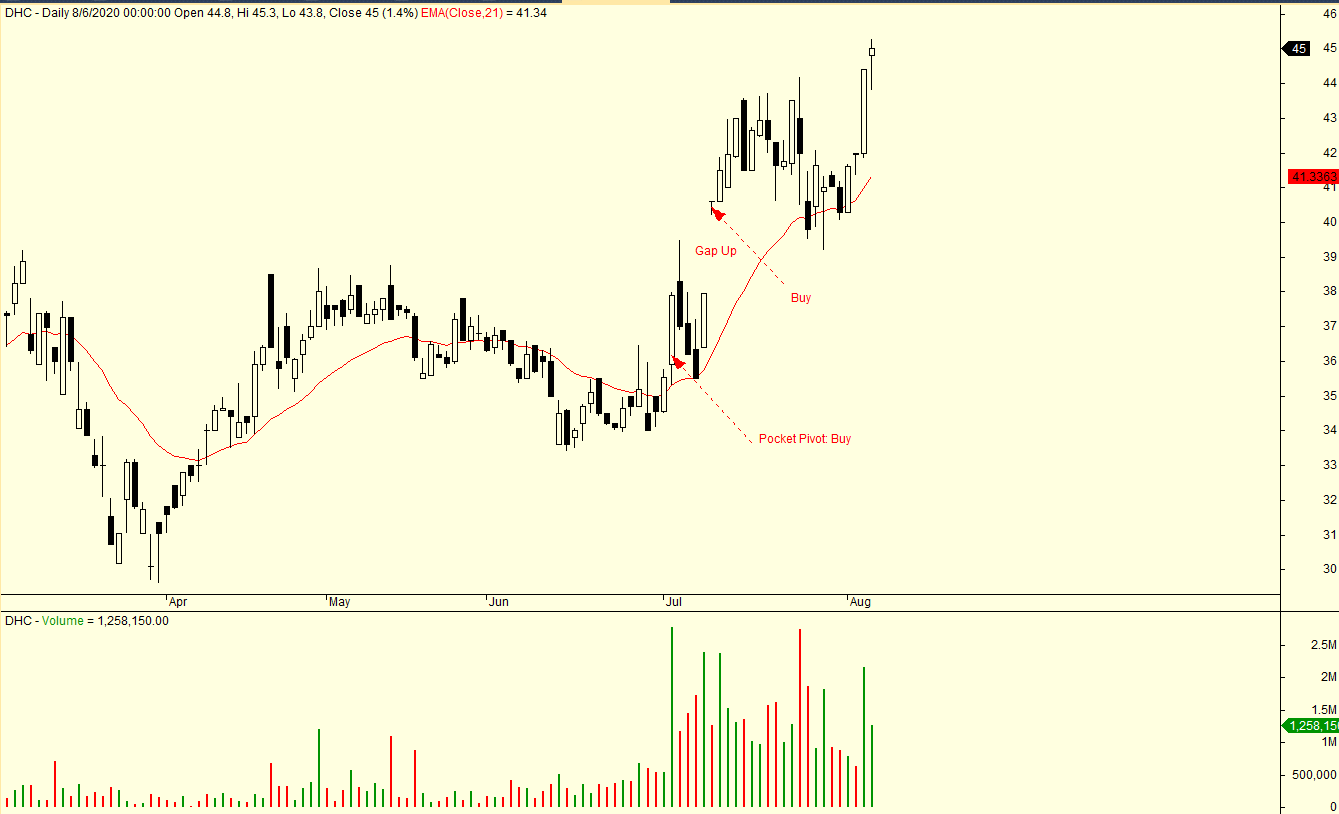 Bất kể mọi thông tin có vẻ tồi tệ ra sao, tôi chỉ tập trung vào hành động giá và khối lượng. DHC dù giảm điểm theo thị trường chung do ảnh hưởng của dịch Covid vào cuối tháng 7 nhưng chúng không hề phá thủng SMA 20 ngày hay EMA 21 ngày. Đó là lý do tôi vẫn giữ nó. Hãy trung thành với chiến lược giao dịch của bạn và đừng nghe điều gì khác. DHC trước đó được chúng tôi mua theo hai kỹ thuật của Trend Trader là Pocket Pivot và Gap Up.