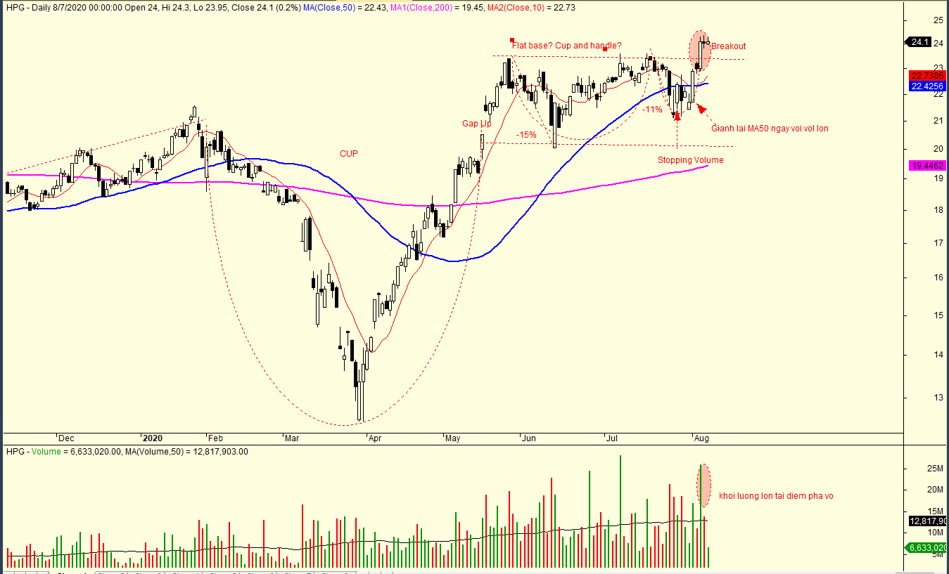Các cổ phiếu leader mà chúng tôi nắm giữ dang hoạt động tốt. Ví dụ HPG của ngành thép trong tuần qua đã có điểm breakout từ nền giá phẳng. HPG có sức mạnh giá RS=90 cùng với sự tăng tốc trong tăng trưởng lợi nhuận.