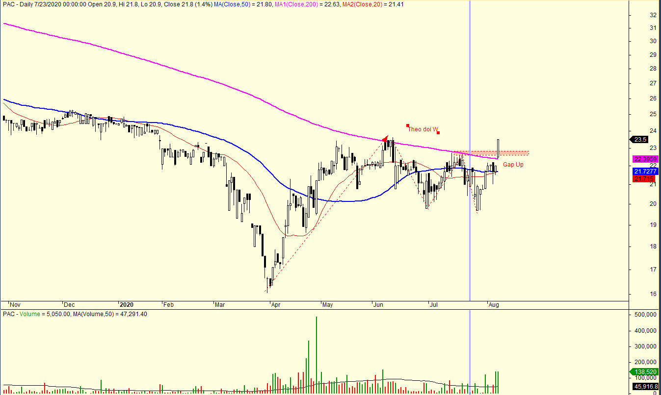 Cổ phiếu PAC có RS=75. Cổ phiếu này có điểm breakout khỏi mẫu hình W bằng một Gap Up. Tuy nhiên, PAC chưa có yếu tố cơ bản hay chất xúc tác thực sự nổi bật. Công ty đang trong quá trình di dời nhà máy từ Biên Hòa 1 vè nhà máy An Phước nhưng chưa có đủ nguồn vốn. Từ năm 2019, công ty tăng trích lập quỹ đầu tư phát triển và giảm tỷ lệ chi trả cổ tức bằng tiền đẻ đầu tư cho nhà máy An Phước.  Công ty sẽ đầu tư nhà máy An Phước trong vòng 2-3 năm tới. Tập đoàn Vinachem sẽ không đầu tư thêm và tạm ngưng thoái vốn tại PAC. Các dự án đầu tư của PAC vì thế sẽ sử dụng vốn tự có hoặc vốn vay.