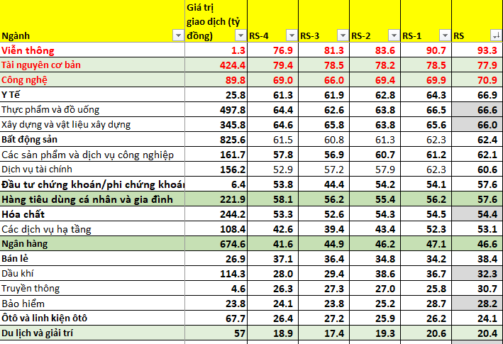Hệ thống CANSLIM yêu cầu bạn phát hiện sóng ngành và các leader để đi theo. Bảng RS (Sức Mạnh Giá Tương Đối) cho thấy ngành công nghệ phần cứng, công nghiệp đa ngành, giấy, thép…đang đứng đầu (dựa trên bảng phân ngành cấp 4 của Fireant).