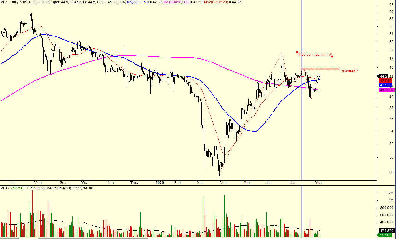 Trong tuần này, chúng tôi nhận thấy nhiều cổ phiếu có RS cao đang tiến gần tới điểm mua pivot. Các thảo luận chi tiết có tại room của Trend Trader. Hiện tại, tôi có thể điểm sơ lược một số mã như sau. VEA có RS=76 và tiềm năng hình thành mẫu hình W.