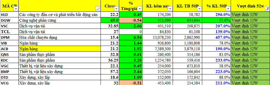 Chúng tôi vẫn giữ quan điểm tích cực về thị trường chung khi các cổ phiếu leader vẫn mạnh và nhiều cổ phiếu vượt đỉnh 52 tuần. Danh sách cho thấy các cổ phiếu thuộc ngành bất động sản khu công nghiệp, sản xuất thực phẩm, phân bón, cảng biển, công nghệ đang trở thành tâm điểm thu hút dòng tiền của thị trường.