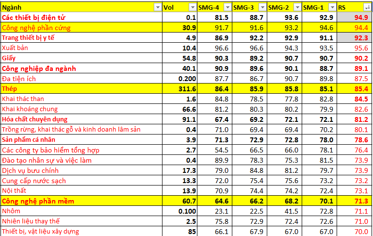 Bên cạnh đó, danh sách RS cho thấy nhóm thép, công nghệ phần cứng, giấy, hóa chất chuyên dụng (phân bón), công nghệ phần mềm đang có RS cao. Danh sách chi tiết các cổ phiếu có RS cao được gửi vào nhóm Trend Trader để tiến hành lựa chọn các leader.