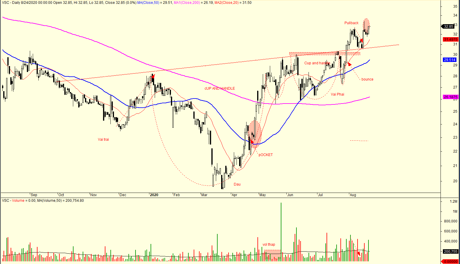 Chúng tôi đang thấy sự mạnh lên của nhóm cổ phiếu cảng biển như VSC, GMD, HAH…Cổ phiếu VSC có vẻ như đã kiểm tra thành công điểm pivot của mô hình Cup and handle.