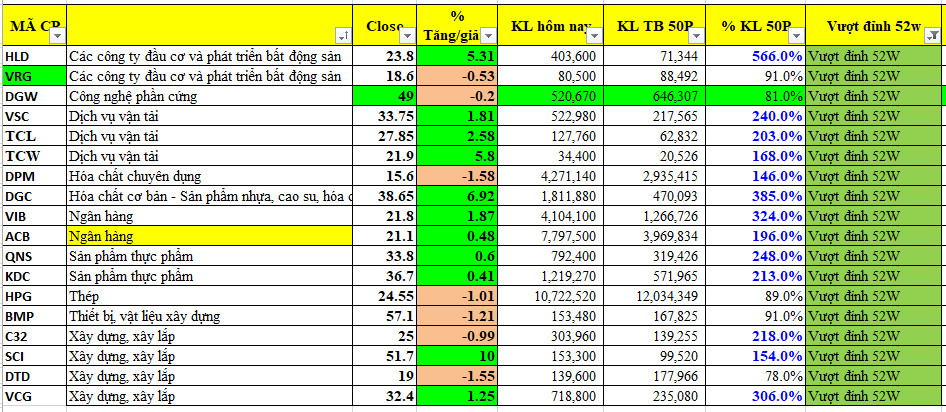 Danh sách cổ phiếu vượt đỉnh 52 tuần của ngày hôm nay tăng lên con số 18, cao hơn con số 13 của ngày thứ hai, cho thấy độ rộng của thị trường đang tăng lên. Danh sách này cho thấy sóng tập trung ở các ngành: Bất Động Sản Khu Công Nghiệp, các doanh nghiệp xây dựng hưởng lợi từ Đầu Tư Công, Cảng Biển, Hóa Chất, Ngân Hàng, Thép, Sản xuất Thực Phẩm.