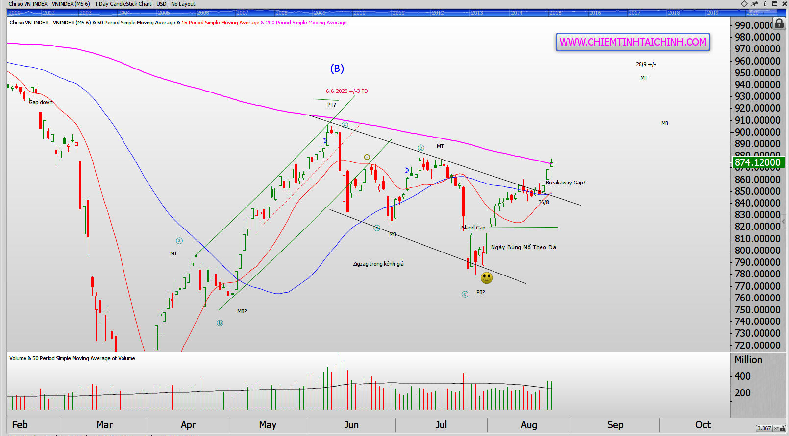 Gần như không có gì để bình luận trong phiên giao dịch hôm nay. Chỉ số VN-Index lại tếp tục tăng điểm 0.6% với thanh khoản tương đương phiên trước. Chỉ số VN-Index đã tăng 3.2% so với giá đóng cửa ngày phân phối 14/8, chúng tôi chờ đợi việc xóa ngày phân phối này theo nguyên tắc 5% của CANSLIM. Khoảng trống Breakaway Gap vào ngày thứ hai đang mở ra hy vọng này.