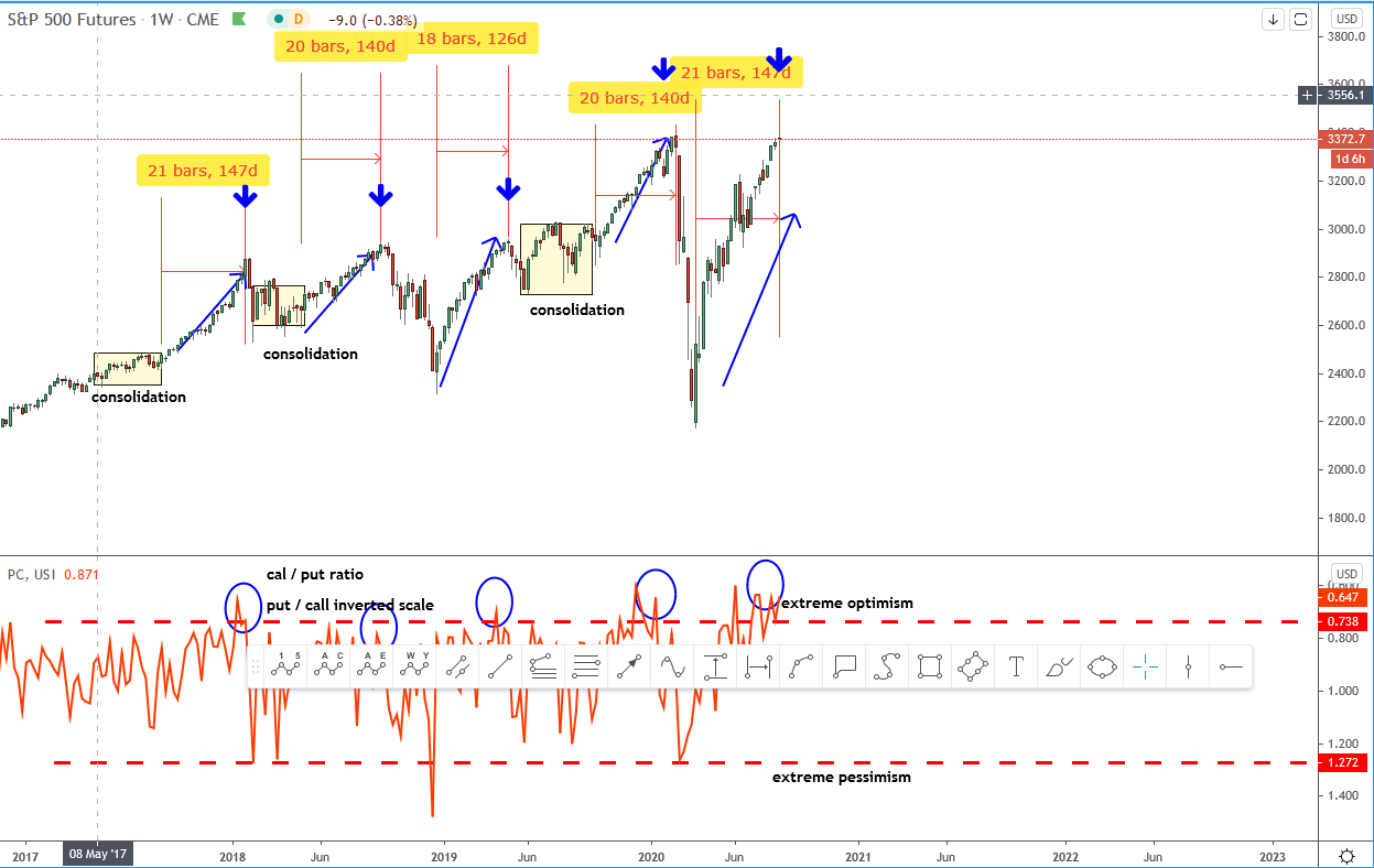 Bức tranh sau cho thấy sự hoạt động của các chỉ báo đo lường Sentiment và chu kỳ tăng 20-21 tuần của SP500. Hiện chỉ số này cũng đã tăng giá 21 tuần và liệu có cú Correction như từng xảy ra trong quá khứ?