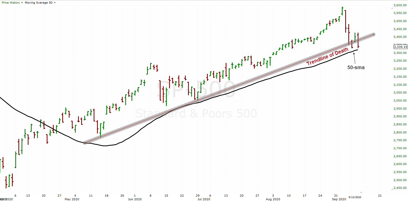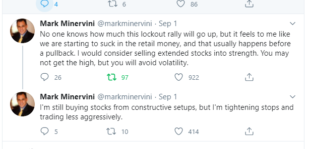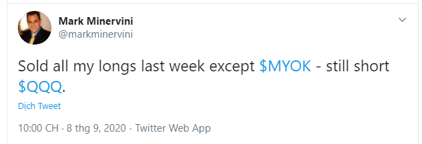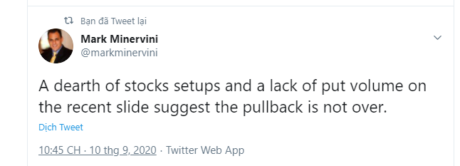 Phù thủy Mark Minervini ngày hôm qua đăng dòng tweet cảnh báo: “Cái chết của các tín hiệu mua và khối lượng bán trong các cú giảm gần đây đề nghị cú điều chỉnh chưa qua.” Bản thân phù thủy Mark đã bán sạch cổ phiếu ngoại trừ một số mã ít ỏi từ ngày 8/9/2020.