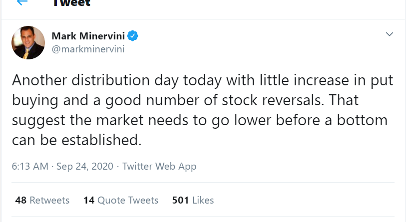 Trên twitter, phù thủy Mark Minervini cảnh báo khả năng tiếp tục giảm sâu hơn vì số người mua mua quyền chọn bán tăng lên khá ít trong khi nhiều cổ phiếu tốt đã đảo chiều. Tâm lý đám đông vẫn chưa thực sự là bi quan quá mức và điều đó ủng hộ cho sự sụt giảm tiếp theo của thị trường. Đáy chỉ thực sự xuất hiện khi đám động hoảng loạn. Còn giờ chi số Put/Call ratio vẫn chưa ở mức hoảng loạn.