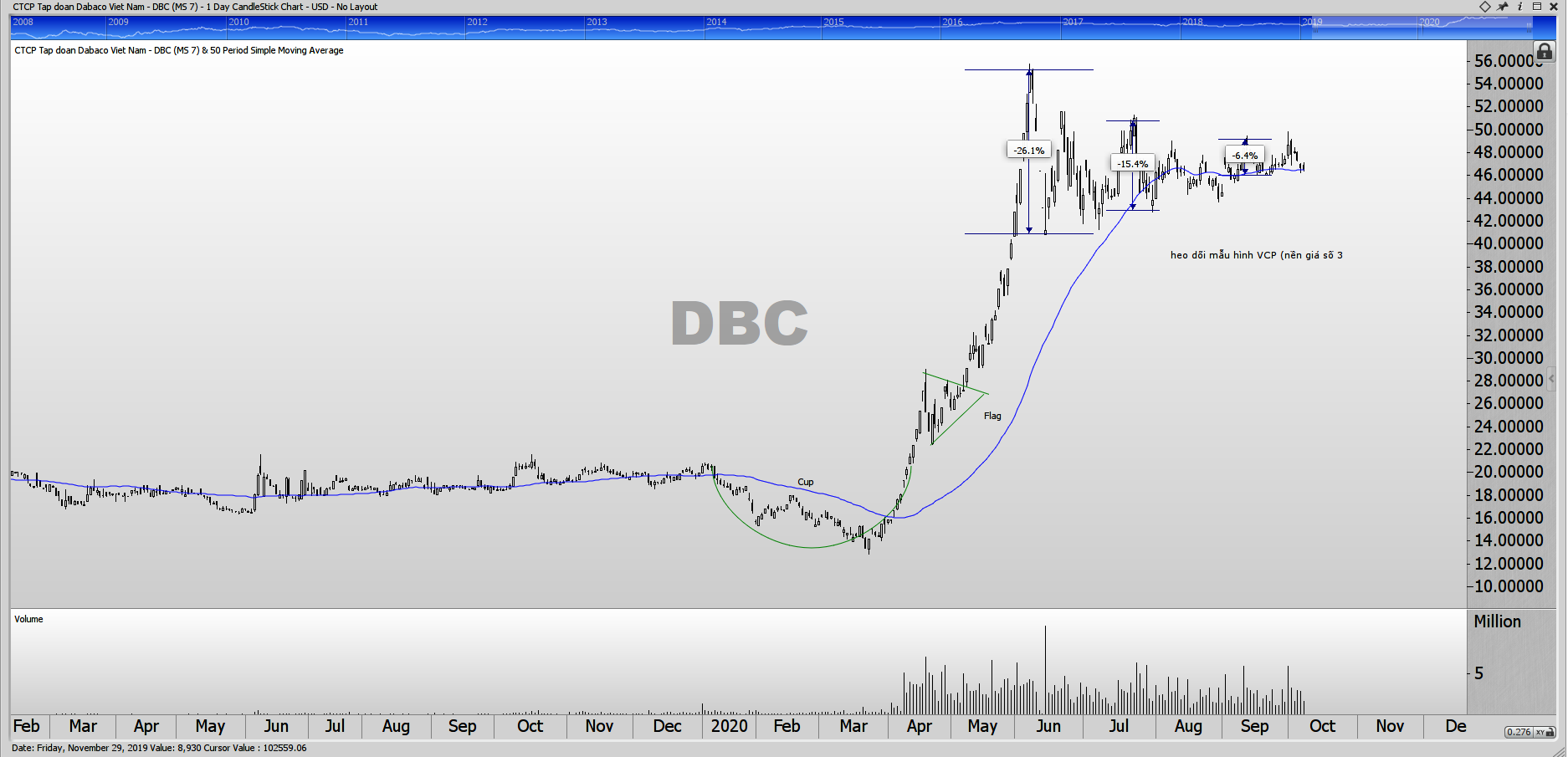 DBC đang hình thành mẫu hình VCP ở vị trí nền giá số 3. Nền giá này có khối lượng thu hẹp. Tuy nhiên, hiện tại vẫn chưa có điểm phá vỡ. Nên nhớ, các nền giá số 3 trở lên điểm phá vỡ trở nên yếu.