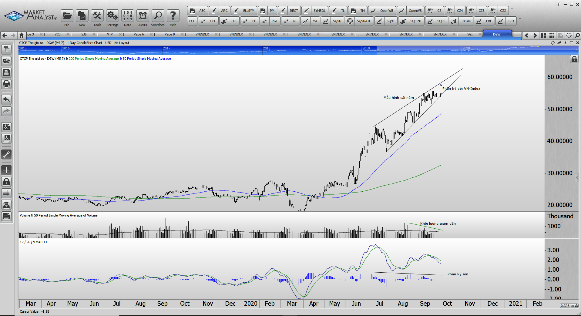 DGW đang phân kỳ với VN-Index, cũng xuất hiện mẫu hình cái nêm. Giá tăng với khối lượng yếu dần và hình thành phân kỳ âm với MACD Histogram.