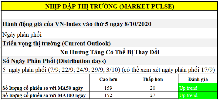 Hiện tại chỉ số VN-Index có 5 ngày phân phối, trong đó 2 ngày phân phối mạnh là 7/9 và 29/9. 3 ngày phân phối còn lại là dạng yếu. Tuy nhiên, chỉ số VN-Index chưa phá thủng MA20 ngày là đường hỗ trợ tốt cho chỉ số VN-Index từ sóng tăng hiện tại vào đầu tháng 8.