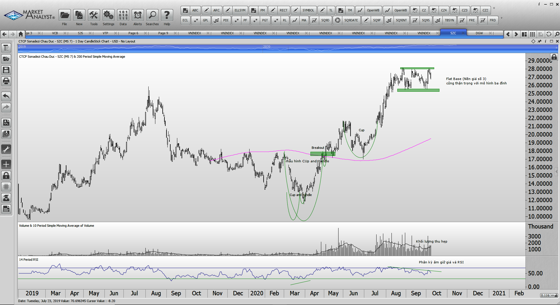 SZC đang tích lũy trong Flat Base, là nền giá số 3. Đang có tín hiệu phân kỳ giữa giá với RSI. Thận trọng khả năng nền giá số 3, cũng là mô hình ba đỉnh vì nó đang phân kỳ với VN-Index. Giá đang cách xa MA200 ngày khoảng 30% là một trong những khoảng cách xa nhất của SZC với đường MA này.