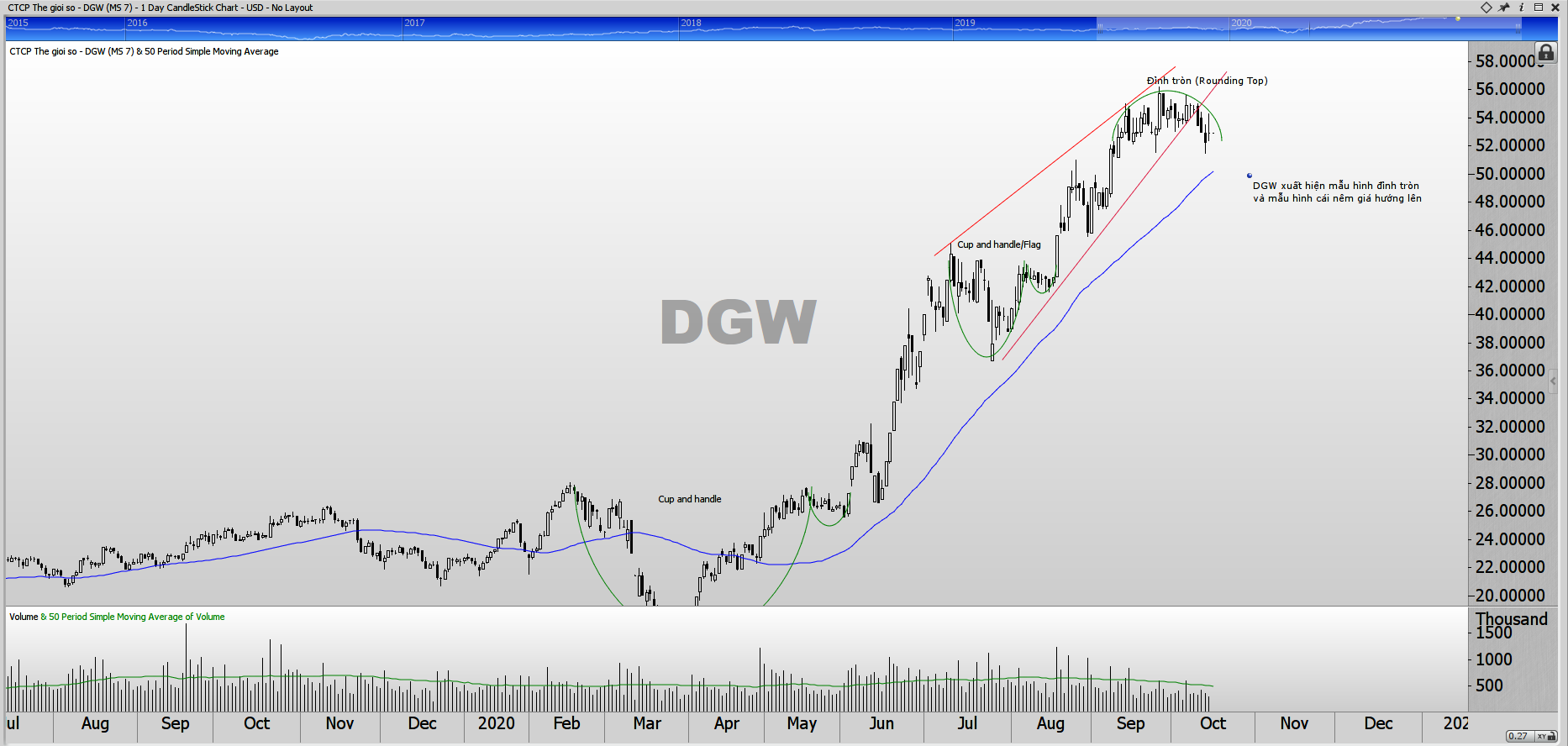 DGW ước lãi sau thuế 75 tỷ trong quý 3, tăng 44%. Xuất hiện mẫu hình Rounding Top và Rising Wedge (Cái nêm hướng lên)