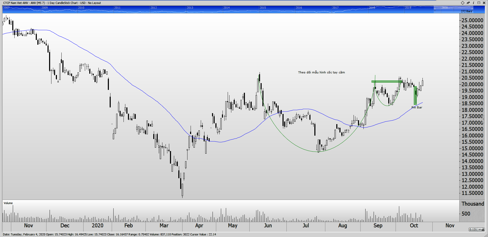 ANV: Giá bật dậy từ MA50 ngày với khối lượng thấp. Khối lượng chưa thật sự thuyết phục cho một cú bounce (bật nảy). Theo dõi mẫu hình cốc tay cầm