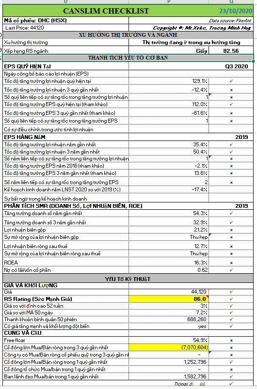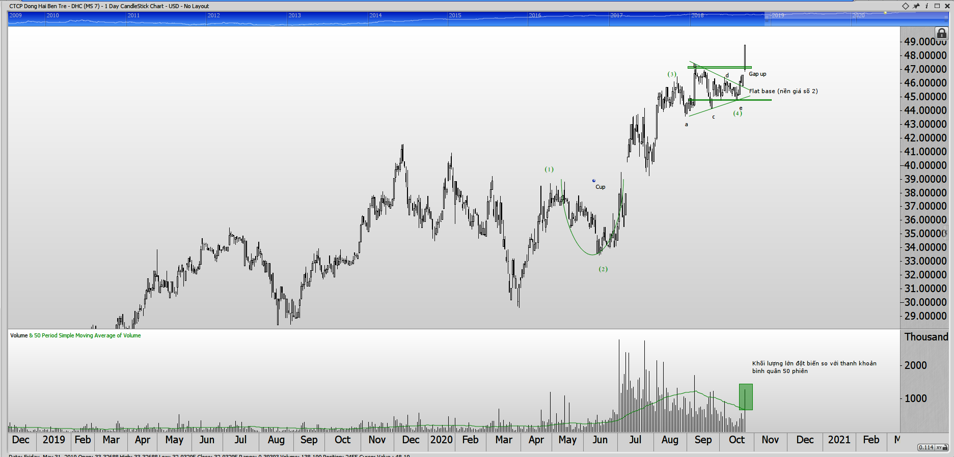Cổ phiếu DHC hôm nay có điểm mua Gap Up với khoảng trống tăng giá đi kèm vol lớn đột biến từ nền giá số hai có nền giá phẳng (cũng là điểm breakout). DHC là cổ phiếu đang có tốc độ tăng trưởng lợi nhuận ba con số trong các quý vừa qua. Biên lợi nhuận gộp đang phục hồi nhờ giá giấy nguyên liệu giảm trở lại.