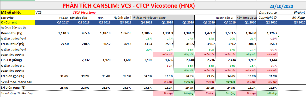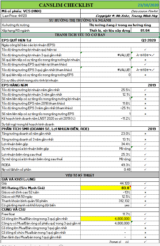 Bảng CANSLIM Checklist cho thấy VCS đang có các nhà đầu tư lớn mua vào trong 3 quý gần đây. VCS chưa công bố kết quả báo cáo quý 3 chính thức. Nhưng ước tính +14% trong quý 3 cho thấy khả năng doanh nghiệp đang thoát khỏi sự giảm tốc trong tăng trưởng lợi nhuận.  Theo báo cáo của cong ty Miare Asset, VCS đang được kỳ vọng sẽ phục hồi nhờ sự hồi phục của các thị trường Bắc Mỹ, Úc, Châu Âu (chiếm 98% doanh số). Trong quý 3/2020,  dây chuyền rung ép số 3 mở rộng với tổng vốn đầu tư 220 tỷ dự kiến sẽ đưa vào vận hành, dây chuyền được đồng bộ công nghệ Breton với tổng công suất thiết kế từ 1,5-1,8 triệu m2/năm.