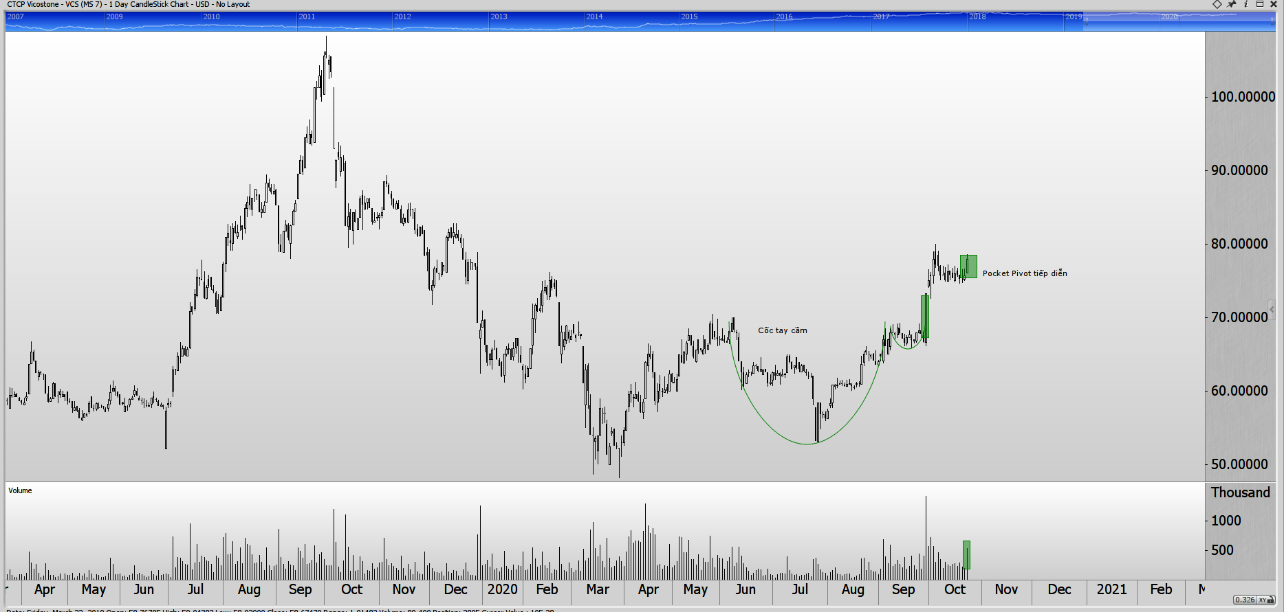 Cổ phiếu VCS xuất hiện điểm pocket Pivot tiếp diễn, sau khi đã có điểm breakout từ mẫu hình chiếc cốc tay cầm ở nền giá số 1. Vicostone (VCS) cũng đã công bố kết quả ước thực hiện quý 3/2020 với chỉ tiêu lãi sau thuế đạt 400 tỷ đồng, tăng 14% so với cùng kỳ và doanh thu thuần cũng tăng nhẹ, lên mức 1.499 tỷ đồng. Lũy kế 9 tháng đầu năm 2020, ước tính VCS mang về 3.994 tỷ đồng doanh thu và 961 tỷ đồng lãi sau thuế.