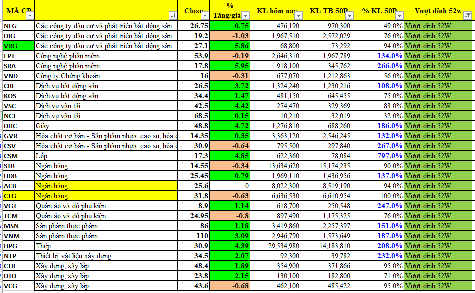 Danh sách cổ phiếu đạt đỉnh 52 tuần cho thấy sóng ngành đang ở ngân hàng, bất động sản, vận tải, hóa chất.